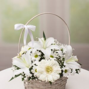Beyaz Lilyum, Beyaz Gerbera ve Beyaz Papatya Kullanılan Diğer Ürünler: Hasır Sepet (Sepet Rengi Stok Durumuna Göre Değişmektedir.) Ürün Boyutu: