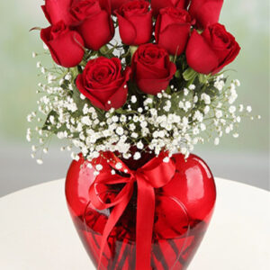 Kırmızı Gül: 11 Adet Kullanılan Diğer Ürünler: Kalp Cam Vazo ve Cipsofilya Ürün Boyutu: 40 cm Aşkınızı bugün en güzel