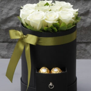 Beyaz Gül: 10 Adet Kullanılan Diğer Ürünler: Çekmeceli Siyah Kutu, 6 Adet Çikolata Ürün Boyutu: 25 cm Sen de aşıklar diyarında mutluluğu