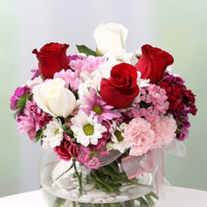 Kırmızı Gül: 3 Adet Beyaz Gül: 2 Adet Rengarenk Bahar Çiçekleri Kullanılan Diğer Ürünler: Yeşillik ve Cam Fanus Ürün Boyutu: