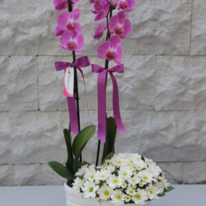 Phalaenopsis Mor Orkide: Çift Dallı Kullanılan Diğer Ürünler: Beyaz Seramik, Modern Ambalaj Ürün Boyutu: 60 cm Sevginizi göstermenin en zarif yolu;
