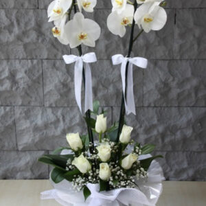 Phalaenopsis Orkide : Çift Dallı Beyaz Gül : 7 Adet Kullanılan Diğer Ürünler : Yeşillik, Cipsofilya ve Beyaz Seramik Ürün