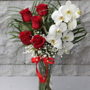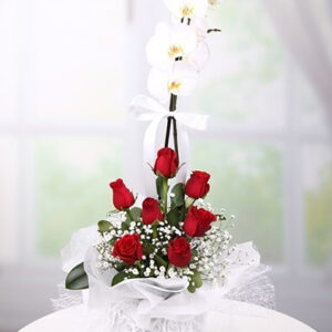Phalaenopsis Orkide: 1 Dal Kırmızı Gül: 5 Adet Kullanılan Diğer Ürünler: Cam Vazo Ürün Boyutu: 50 cm Aşk dolu güller,