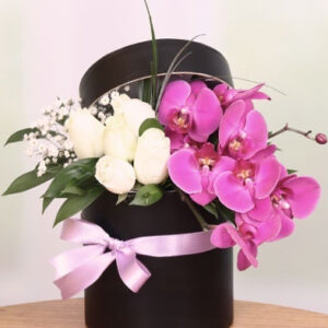 Beyaz Gül : 5 Adet Phalaenopsis Orkide: 1 Dal Kullanılan Diğer Ürünler : Yeşillik, Cipsofilya, Siyah Kutu Ürün Boyutu :