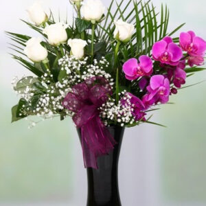 Phalaenopsis Orkide ve Beyaz Güller Yaklaşık Ürün Boyutu : 50 cm Kullanılan Diğer Ürünler : Siyah Cam Vazo Unutulmayacak bir