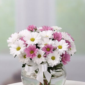 Pembe ve Beyaz Papatyalar Kullanılan Diğer Ürünler: Cam Fanus Ürün Boyutu : 40 cm Pembenin muhteşem güzelliğini, gözlerinde aşkı yaşadığınız