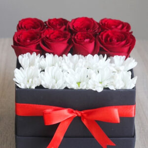Kırmızı Gül: 8 Adet Beyaz Papatya: 10 Adet Kullanılan Diğer Ürünler: Siyah Kare Kutu Ürün Boyutu: 18 cm Kırmızı güller