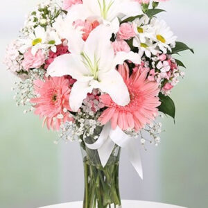 Pembe Gerbera: 5 Adet Beyaz Lilyum: 1 Adet Renkli ??????Bahar Çiçekleri Kullanılan Diğer Ürünler: Yeşillik ve Cam Vazo Ürün Boyutu: