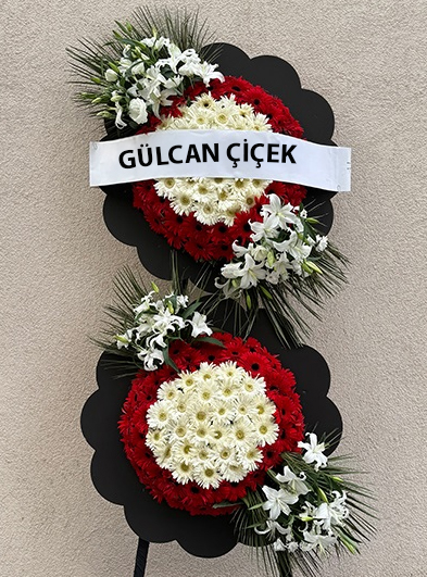 Üst katta 80 adet kırmızı beyaz gerbera, alt katta 80 adet kırmızı beyaz gerbera kullanılarak yapılmaktadır. En az açmış 10 dal lilyum kullanılarak aralarına 10 dal lisyantus eklenerek çıkma yapılmaktadır.